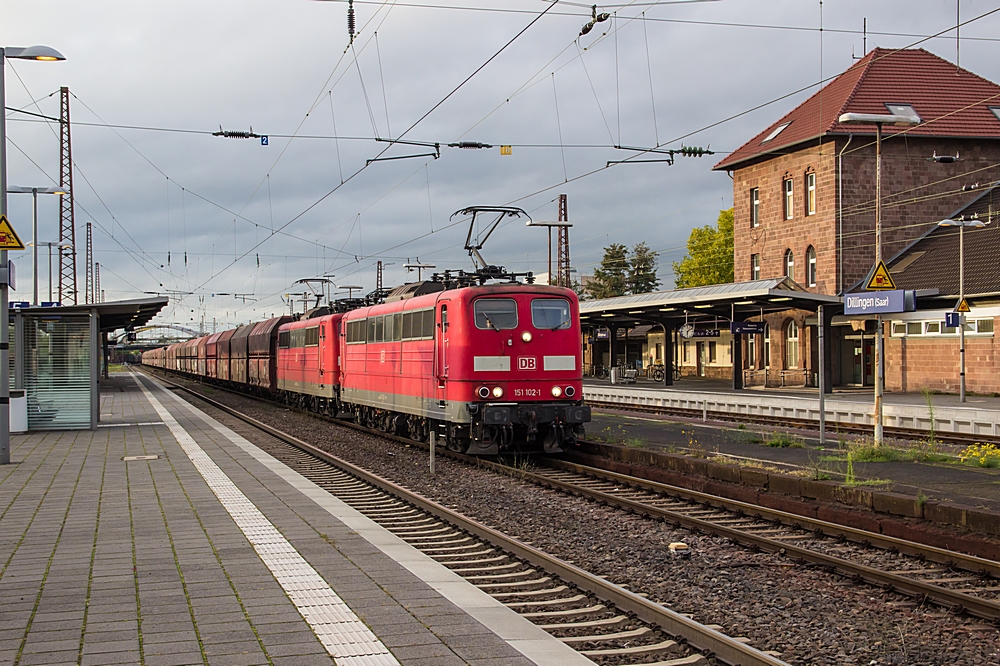 151 102 und 151 130 haben mit dem GM 48727 von Amsterdam Westhaven zur Zentralkokerei Dillingen am 6. Oktober 2015 ihr Ziel fast erreicht;