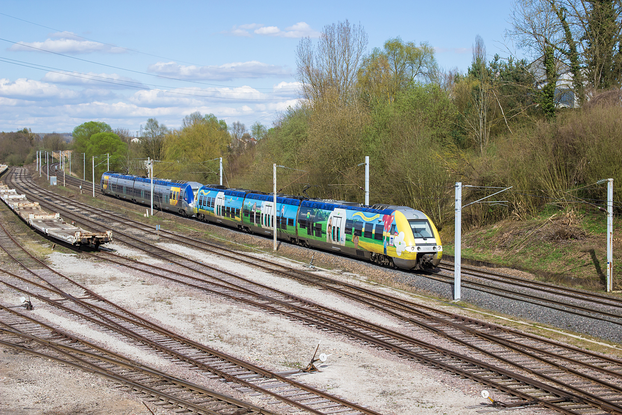 Z 27824 kommt am 30. Mai bei Rosbruck als TER 23722 Forbach - Metz Ville vorbei