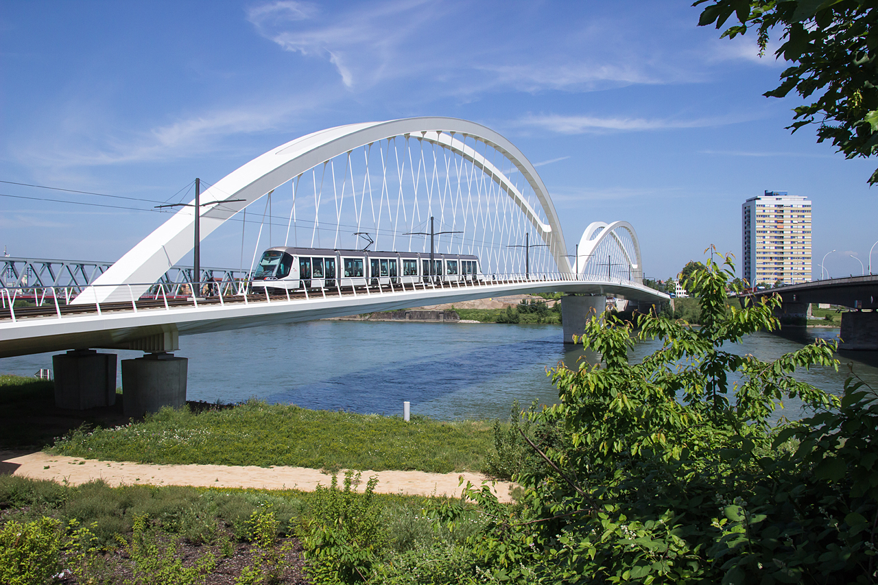 Triebwagen 3001 der CTS Strasbourg überquert am 18. Mai 2018 als Zug der Linie D von Kehl Bahnhof nach Strasbourg Poteries die neue Rheinbrücke zwischen den beiden Städten