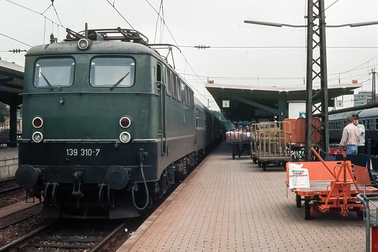 Am 15. August 1982 wartet die Offenburger 139 310 in Freiburg mit dem E 3541 Freiburg - Villingen auf die Abfahrt ins Höllental, die um 12:15 Uhr erfolgen wird