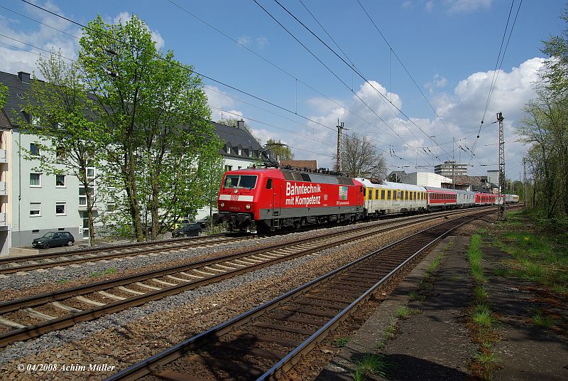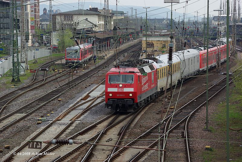 In der Mittagszeit in Trier - S?d, dieses mal 120 501-2 vorne, wird der LIREX nach Mettlach gezogen.