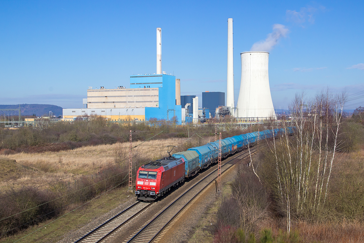 185 044 kommt am 26. Februar um 11:14 Uhr mit dem Kupferzug GM 44420 Wroblin Glogowski (PL) - Cottbus - Forbach - Lens (F) am Kraftwerk Ensdorf vorbei